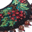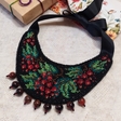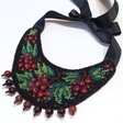 Exquisite calm necklace with beads made of natural stone with beaded asymmetrical pattern. An author's embroidery pattern with the plot of the bunch of guelder rose is used in this necklace. The necklace is made in classic colors of folk embroidery on a neutral black background. Despite such an abundance of colors and shapes, the necklace looks restrained, which makes it a very practical accessory.