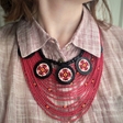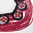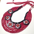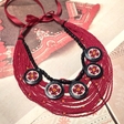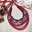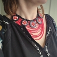 Bright Ukrainian-style necklace, inspired by traditional ducats - coin necklace, combined with beaded necklaces. In this necklace, the "coins" are made of artificial leather with an embroidered insert with a traditional ornament. The typical red bead strings also have playful colored inserts. The necklace is not too massive and not heavy, it is tied on narrow ribbons. It can be worn as a choker at its shortest length, or worn down as a more casual necklace.
