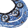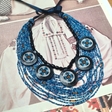 Кольорове намисто в українському стилі, натхненне традиційними дукатами - намистом із монет, у поєднанні з бісерними намистами. У цій прикрасі "монети" виконані зі штучної шкіри з вишитою вставкою з традиційним орнаментом. Бісерні низки виконані у кількох відтінках волошково-синього і також мають грайливі вставки темно-золотого, майже бурштинового кольору. Намисто не надто масивне і не важке, зав'язується на вузькі репсові стрічки. Його можна носити як чокер на найменшій довжині, або нижче як більш звичне намисто.