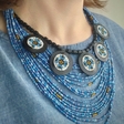 A colorful Ukrainian-style necklace inspired by traditional ducats - a coin necklace combined with beaded necklaces. In this necklace, the "coins" are made of artificial leather with an embroidered insert with a traditional ornament. The beaded strings are made in several shades of cornflower blue and also have playful inserts of a dark gold, almost amber color. The necklace is not too massive and not heavy, it is tied on narrow ribbons. It can be worn as a choker at its shortest length, or worn down as a more casual necklace.