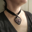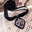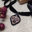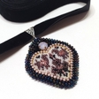 “Singing Heart” pendant, purple & pinkA diamond-shaped pendant, embroidered with beads and Czech rhinestones, on a burgundy velvet ribbon. The necklace is inspired by the heart-shaped Ukrainian dukach heart shaped pendants. The embroidery contains motifs of two birds, a symbol of family well-being, and a flower, a symbol of harvest and prosperity. The pattern is clear against a light background, with bright glowing pink opal rhinestones and purple highlights. The ribbon will allow you to adjust the length of the necklace: from a choker close to the neck to a classic low hanging pendant.